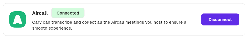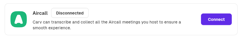 The green "Connected" label will disappear and you will see the "Connect" button again. From this point forward, Carv will no longer automatically record the calls you make with Aircall.